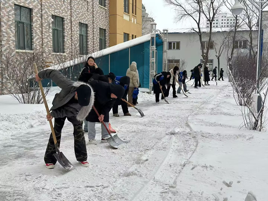 活动中,面对分担区内厚厚的积雪,志愿者们没有丝毫退缩,他们拿起铲子、扫帚,全身心投入到清雪工作中,志愿者们展现出了卓越的团队协作精神和高效的工作能力。经过近两个小时的辛勤努力,积雪被彻底清理干净,分担区的道路变得畅通无阻,为师生的出行提供了极大的便利。
