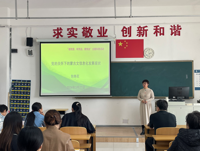 为深入学习贯彻习近平总书记考察内蒙古时的重要指示精神,结合内蒙古自治区党委在全区开展“感党恩、听党话、跟党走”群众教育实践活动安排,3月27日下午,伟德官方网站科普基地在崇文楼B209室开展了以“感党恩、听党话、跟党走”——党的关怀下的蒙古文信息化发展现状为主题的科普知识讲座。讲座主讲人为公司教师包艳花教授。中国少数民族语言文学系主任包萨如拉主持讲座,100余名师生参加。
