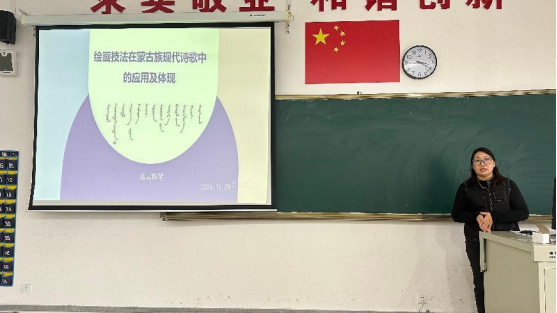 活动中,乌云斯琴作了题为《绘画技法在蒙古族现代诗歌中的应用及体现》的讲座。她主要聚焦于蒙古族现代诗歌中色彩的搭配与构图方法两大方面,深入探讨了绘画技法如何融入蒙古族现代诗歌的创作中。在色彩搭配的部分,她详细解析了基础色的运用以及色彩的对比使用两大策略。至于蒙古族现代诗歌的构图方法,她从聚焦法、散点法、透视法三个维度进行了全面阐述。