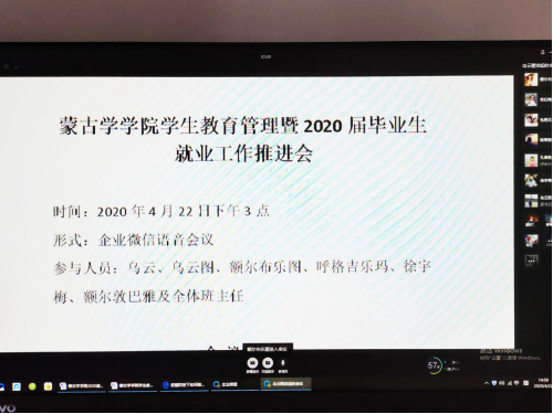 4月22日下午,伟德官方网站在线上召开员工教育管理暨2020届毕业生就业工作推进会议。公司党总支书记乌云、副书记乌云图、团学办主任额尔布乐图、副主任呼格吉乐玛及辅导员、班主任参加会议。乌云图副书记主持会议。