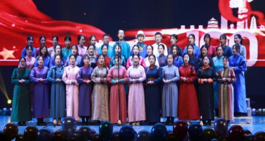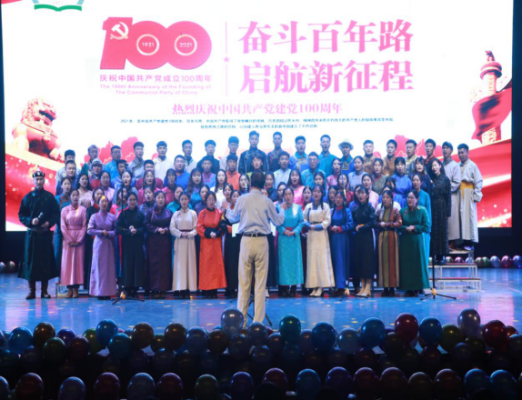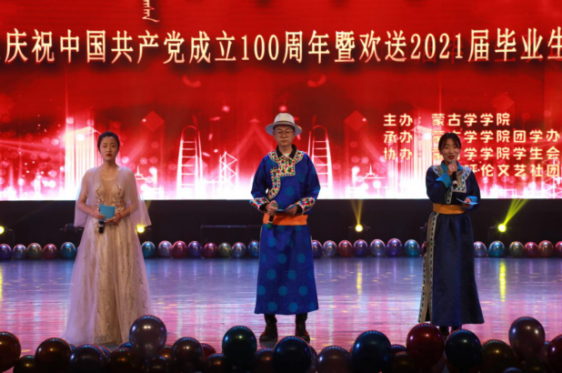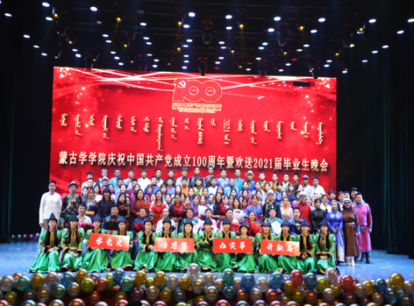 晚会在师生大合唱《草原上升起不落的太阳》《百年颂歌》中缓缓落下帷幕。毕业生代表向老师们敬献鲜花,表达对母校和恩师的感恩之情。在筹办晚会中老党员贺喜格图老师为纪念建党100周年,分别创作了《党的恩情》(诗)和《百年颂歌》(歌词)原创作品,特此向中国共产党成立100周年献礼,表达了师生对党的忠诚、深厚的情感和永远跟党走的决心。